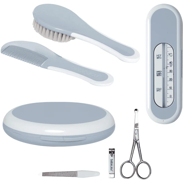 bébé-jou ® ofrece una gama de productos de cuidado muy completa y de alta calidad. ¡Sólo lo mejor es bueno para tu bebé! El set de manicura se compone de tijeras de uñas, cortaúñas y lima de uñas en un estuche a juego. El peine con púas redondeadas y el cepillo con cerdas naturales son aptos para el bebé. Perfecto para la piel sensible del bebé.