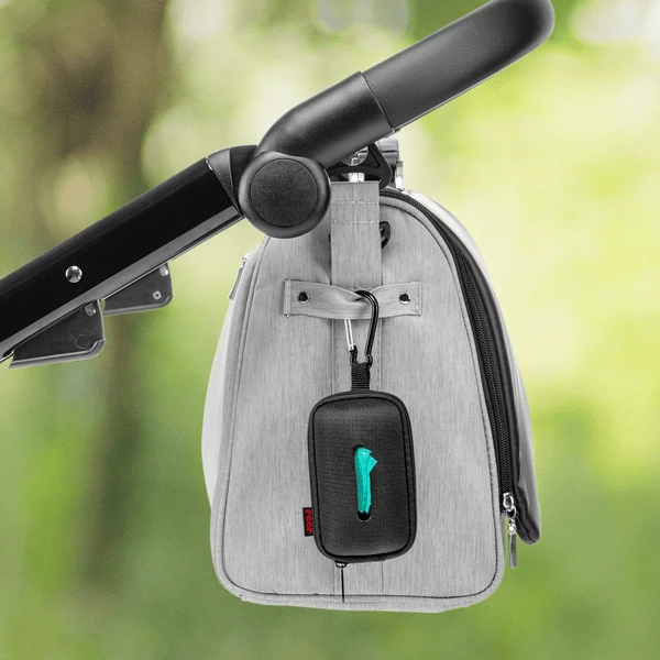 El dispensador también está equipado con un robusto mosquetón Metal l. Esto hace que sea aún más cómodo de usar cuando se está fuera de casa. Sólo tienes que engancharlo a tu bolsa de pañales y el dispensador estará siempre a mano, sin la molestia de tener que rebuscar en tu bolsa.