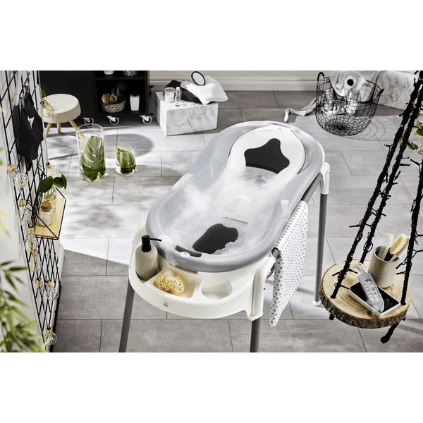 Si la bañera está en el suelo, se puede usar con máx. 55 kg: eso es suficiente para bañar a 2 niños al mismo tiempo hasta el mes 36. La bañera de bebé también ha sido sometida a pruebas de inocuidad química y se puede lavar fácilmente con agua tibia y jabón.