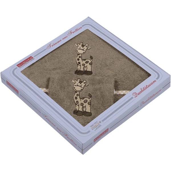 Gran conjunto que consiste en una toalla de baño con capucha y un guante de lavar hecho de un suave tejido de rizo, ambos artículos tienen un bordado de jirafa. El conjunto es ideal como regalo.